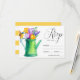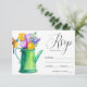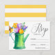 Trendig Rustic stil bröllopsinbjudningar OSA med en vattnande burk av tulpaner och blommor och en fågel och vit och gult stripe mönster på kortets baksida. Dessa inbjudan är perfekter för en land-, bondgård-, trädgårds-, party- eller barnyard- eller stil-bröllopsfest. Den här designen är även tillgänglig för andra händelser. Kontakta oss via butiken om du vill ha anpassningsbar