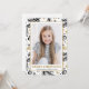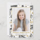 Glada och trendiga julkort med ditt favoritfoto i stående format, ramade av guld, vitt och svart järnek och tall, stjärnor och snöflingor i en doodle-art stil.