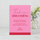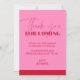 Visa din tacksamhet med stil med det rosa och röda Chic Eleganta Födelsedags tackkortet. Framsidan har en snygg rosa bakgrund som övergår i en lyxig röd bas och skapar en sofistikerad kontrast som omedelbart fångar ögat. Överst står det "tack för att du kom" med fet röd stil, följt av ett hjärtligt tackmeddelande och "kärlek + [namn]" med matchande röda bokstäver. Baksidan fortsätter elegansen med en slät röd bakgrund som ger gott om utrymme för en personlig anteckning. Detta rosa och röda Chic Eleganta Födelsedags tackkort är perfekt för födelsedagar i alla åldrar och erbjuder ett tidlöst, chic och elegant sätt att uttrycka uppskattning.