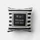 Elegant personlig initial monogram kastkudde med svart-vit randigt mönster med dina initialer och efternamn med ert fastställda datum i en svart kantad fyrkant med klassisk vit text. Designad av Thisisnotme©