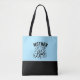 Denna vackra, modefulla handväskan visar "Mor till bruden"-tryck på en anpassad svart färg med den övre delen av väskan i en anpassad ljusblå färg. Svart handtag. Medelstorlek visas.