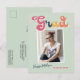 Trendig-reflektor, vykort för studenten-meddelande, med inslag av vintage stil-typografi med texten ’Grad’ i boho färg av regnbågen. Fotot i student markeras med tunna vita kantlinjer. Bakgrund till ljusmint grönt färg eller redigera och ändra färg efter behov. Kortets baksida ger personlig textutrymmen för information om studenten. Perfekt för gymnasiet, högskolan och universiteten.