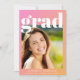 Trendigets inbjudan till studentfest för rosa och orange med student, grad i ett stort fet vitt brev och hennes namn, skolår och klassår i enkel modern vit typografi. Baksidan har "grad party" i samma fet vita teckensnitt och dina party-detaljer.