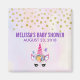 En babyduschmagnet designad med en trendig rosa unicorn. Lägg till med ett hörlstycke i blommigten finare. De vidriga fjärilarna flyger runt. Fake guld konetti sprinklade längs toppen. En vattenfärgsbakgrund för blekens lila och gult.