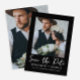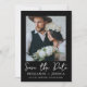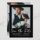Det här bröllop spara datum-meddelandekortet i trendig innehåller två bilder och chic vitt sparar det datumskrivna skriptet på en elegantens svarta bakgrund. Baksidan är ett fullt foto. Låt gästerna veta att du kommer att bjuda in dem till ditt kommande bröllop med detta enkla, minimalistiska foto spara datumkortet (klassiska koordinerande bröllopsinbjudningar kan skickas vid ett senare tillfälle och kan köpas separat).