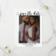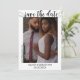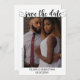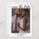 Modern bröllop spara datum-mallkort med trendig-skripttext med hjärtan. Mallfunktion ett foto av lodrät. Foto och text kan enkelt vara personlig för en unik och snygg design för din speciella dag.