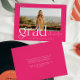 Det här moderna och trendig studenten-meddelandet har en shock rosa och vit färg-palett och ett stort foto av student. En fet och snyggt "Grad" står på framsidan. Kortets baksida har en enkel typ som gör att du kan få mer information om student och deras framtidsplaner. Du kan också ändra den till en studentfest-inbjudan. Du hittar andra versioner av den här designen i min Zazzle-butik.