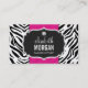 Exempelbilden: Trendig Snyggt Zebra tryck Diamond Girly Shock rosa Personlig Business Card-mall. Alla textstorlekar stil, färg, kan ändras för att passa dina behov. Det här är perfekt för Mode Stylist, Hairstylist, Hairdresser, Jewelry Designer, Nail Technician, Cosmetolog, Makeup Artist med mera. Kontakta mig om du behöver anpassa dig.