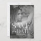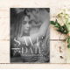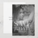 Modern bröllopsinbjudan Save the Date-mall postkort med trendig typografi överlagring text. Mallen har ett vertikalt foto. Fotot och texten kan enkelt anpassas för en unik design för din speciella dag.