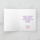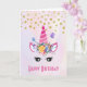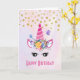 Ett hälsningskort i Grattis på födelsedagen med trendig rosa Unicorn-illustration med blommigtens huvuddel och vismliknande fjärilar som flyger runt. Fake guld konetti sprinklade längs toppen. En vattenfärgsbakgrund för blekens lila och gult. Personlig på insidan.