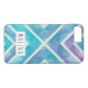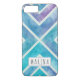Watercolor geometric chevron rand blue och lila iPhone 7 fodral. Denna moderna utformning inriktas på det vackra lila och blå färg och vattenfärgeffekten i det strimlade mönster. Det är personlig med ditt namn i ram.