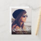 Denna stilrena examensannonseringskort har ett foto av din examen, "Graduate" överlagrat högst upp i en trendig vit typografi med unika linjer och hans eller hennes namn, skola och klassår i enkel vit typografi. På baksidan kan du lägga till ytterligare ett foto och en anpassad annons.