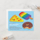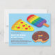 En trendig och färgglad inbjudan som är perfekt för sommar-, strand- och vatteninspirerade fester! Den har uppblåsbara poolflottörer i former av läckra maträtter såsom en pizza med svamp, paprika och salami, en regnbågssnurrande glass och en munk med regnbågssprinklor som flyter på vattnet. Anpassa enkelt med din festinformation i de medföljande textmallarna. Perfekt för födelsedagsfester för tweens, tonåringar och vuxna!