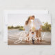 Modern handskriven ogenomskinlig text i vitt skript täcker för fotokort med fullt utfall. Du kan ändra storlek, rotera och flytta texten så att den fungerar med fotot. Ett övertoningsfilter (tillval) har lagts till för ljusfoton.