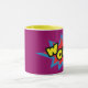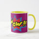 Roligt och snyggt är det här kaffet i mugg som har "Wow" inuti en stjärnblå och röd textruta. Bakgrunden är lila. Insidan och handtaget är gult. Beställ din i dag! Clipart: AnneIllustration https://www.etsy.com/shop/AnneIllustration