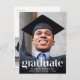 Ett modernt vykort för studenten-meddelande och partiinbjudan som innehåller graderns foto överlagrad med "Student" i trendig, stor vit text och deras namn, skolår och klassår i enkel vit typografi. På baksidan lägger du till ytterligare ett foto och information om grad party.