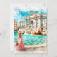 Det här vykortet visar ett akvarellporträtt av en blond kvinna som kastar ett mynt i Trevi-fontänen i Rom, Italien.