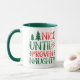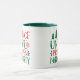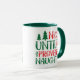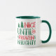 "Nice tills bevisad naughty" säger rött och grönt om mugg. Tillsammans med den skarpa, nedtryckta texten är grönt gräs träd och rött snöflingor. Bilden skrivs ut två gånger på mugg.