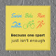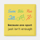 En rolig och inspirerande magnet för en triatlet. Texten är "För att en sport inte räcker". Det finns tre "simma Cycle springa"-ikoner för att visa en triathlon, i blått, grönt och orange på en ljus gult.