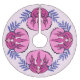 En rosa- och lila-triceratops porträtt, som flankeras av abstrakt lila löv, är subjekt i denna roligt grafiska utformning.
