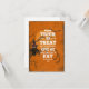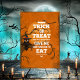 En söt, svart uggla med en rolig spetsig hatt sitter på en brun, knölig bladlös trädgren medan bruna silhuettfladdermöss flyger ovanför i det gula månljuset. En orange, grungig bakgrund gör detta läskigt och kusligt men ändå roligt.