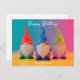 A vibrant and playful digital render of three stylized garden gnome figurines with a high-gloss ceramic finish. Each gnome features a tall, curved hat in red, blue, or lime green, paired with a white textured beard and a round peach-colored nose. The trio is arranged on a bright yellow surface against a colorful gradient background of teal, pink, and orange. Customize it for birthdays with the name of your choice.