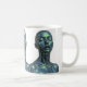 Three identical green-toned female androids with closed eyes, side by side on a white mug.