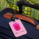 Luggage Tag, With a Beautiful Picture of Triple Pink Roses, on the front of it, ( With the Background removed )= ( Picture by P.J.M.) With a Color Pink Background.