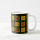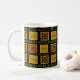 Mugg har en svart historikdesign av cirklar, trianglar, diamanter, linjer och zigzager som bildar ett mönster.