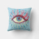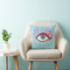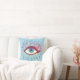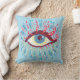 Psykedeliska öga-kudden med en färgstark illustration av en konstig blå öga med stora glättade rosa-ögonfransar, ljusblå tårar som flödar överallt och många rosa och grönt inslag - ögonfransar förlängda.