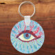 Psykedelisk nyckelkedja i öga med en färgstark illustration av konstig blå öga med stora glättade rosa-ögonfransar, ljusblått tårar som flödar överallt och många rosa och grönt inslag - utökning av ögonfransarna.