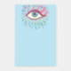 Psykedeliskt anteckningsblock i öga med en färglös illustration av ett konstig blått öga med stora böjda rosa-ögonfransar, ljusblått tårar som flödar överallt och många rosa och grönt inslag - utökning av ögonfransarna.