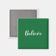 Mörk grönt kvadratisk magnet med vit text. Citatet säger "tro".