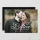 En modern design av älskvärd typografi, som läser "tror - i magin av säsongen" och särdrag ett i naturlig storlek foto av din lyckliga familj. Ställe på baksidaen för att dig ska tillfoga ditt personliga helgdagmeddelande eller mer foto. En härlig samtida hälsning för några Julhälsningar. Speciellt trevligt för din första jul tillsammans som make och fru.