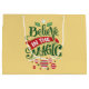 En presentväska med en illustration av coolan. Det står att tro på magiken i finare. Dekorerad med christmas bollar.