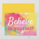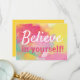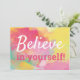 Glad, motiverande, inspirerande citat, "Tro på dig själv!" Detta är ett kort med visdomsord att leva efter dagligen. Designen har en färgrik abstrakt blomstervattenfärg i pastella nyanser av rosa, gul och turkos. Baksidan av kortet är i matchande gyllengul. Teckensnitt är i matchande rosa och vitt. Färgerna på båda teckensnitt kan enkelt anpassas i Zazzles designverktyg. Andra designer finns tillgängliga.