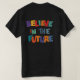 Den här inspirerande t-shirt-designen innehåller frasen "Tro på framtiden" i fet, flerfärgad brev mot en dynamisk bakgrund med abstrakt. Utformningen förmedlar ett budskap om hopp, optimism och trosförmåga. Det uppmuntrar de fattiga att anamma ett positivt perspektiv, se till att framtiden blir ljusare och vidta åtgärder för att skapa en bättre värld.