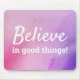 Ljus och glad, motiverande citat, "Tro på goda saker!" Denna inspirerande typografi-design har visdomsord att leva efter dagligen. Designen har en färgrik abstrakt rosa och lila akvarellbakgrund. Typsnittet är ljust vitt. Färgen på typsnittet kan enkelt anpassas i Zazzle designverktygssektionen. Andra designs finns tillgängliga.
