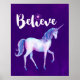 En poster med en söt vattenfärgad encorn som är målad i mjuka pastellvattenfärger av rosa, lila och blått. I den inspirerande typografitexten står det att tro på ett trendig med en stjärna ovanför brev i. Ange på royalets lila-bakgrund.