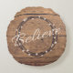 Tro på textdesign för jul med andedräkt och snö dekoration på bakgrunden av rustiskt trä