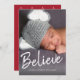 Tro Script Baby första julmodern foto. Anpassa det här trendigets handskrivna fotoövertäckningsdesign med ord "Tro" i vitt. Ett modernt enkelt helgdag-fotokort. Elke Clarke © Baksidan har en träd mönster-design som du kan ta bort om du vill använda redigeringsmenyn.