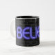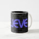 Upplyst tegelvägg i tätbebyggelse med tro-text på glödande lila neon ljus.