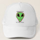 Hattar med ett konstverk av en grön främling, med formulera "troende av liv på andra planet".