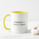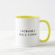 Anpassningsbar mugg med trendig minimalistisk textdesign med "troligen gin & tonic" i klassisk sans serif-typografi. Gör en fin gåva till dig själv eller till vem som helst som gillar gin, gin och toniska cocktails, eller kaffe koppar med roliga meningar. Texten kan redigeras så att du kan anpassa den på båda sidor. Finns i flera olika stilar och färg.