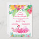 Bachelorette Party helg getaway-inbjudan har vattenfärgsflamingos och tropiska blommor. Inbjudan kan anpassas ytterligare för evenemanget genom att klicka på anpassningsknappen grund i textrutan.