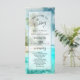 This beautiful wedding program features a beautiful design with a watercolor background of a pristine tropical beach with turquoise waters and palm treel. The text is features elegant script calligraphy with space for the couple's name, wedding date, ceremony, bridal party, and a short thank you. Lovely, stylish, and chic, this program is perfect for a coastal or island destination wedding.