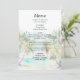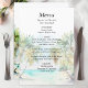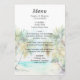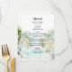 Den här eleganten och den vackra menyn bröllop med vattenfärg har en strand, blå himmel och handflatan träd. Texten kombinerar handskript och sans serif typsnitt för en snyggt och ett modernt utseende. Det här är perfekt för en sommarstrand eller ett tropiskt destinationsbröllop.