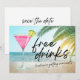 Ge ger dina gäster en antydan om roligten till kom med de här roliga "gratis drinkar (och vi gifta sig oss) bröllop på stranden sparar datumet! Den här leksaken är perfekt för det roligt paret som inte kan vänta med att fira med familj och vänner på sitt tropiska strandbröllop.