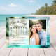These beautiful wedding save the date cards feature your photo and a customizable calendar on a watercolor background painting of a pristine tropical beach with turquoise waters and palm trees. The caption reads: Save the Date in elegant script lettering, and there is a cute romantic heart that you can put around your special day. There is space for your names, the wedding date & location below. Wonderful way to let your friends and family know about your upcoming wedding, especially appropriate for destination weddings in exotic locations!