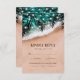 Svarskort på målbröllopsmeny med en tropisk sandskö, havsyta vinkarare, romantiska handflatan löv, sträng ljus och en osa för livsmedel från bröllop.